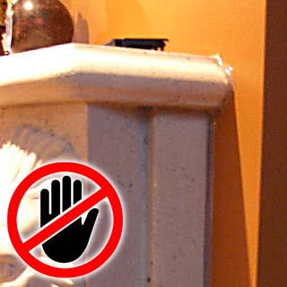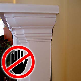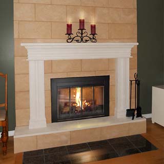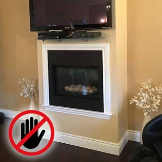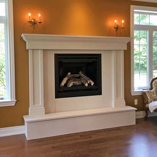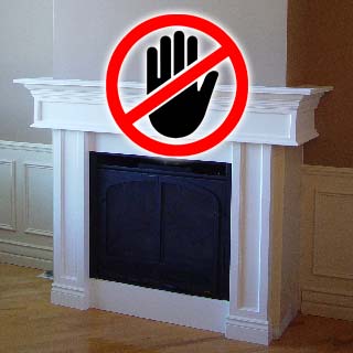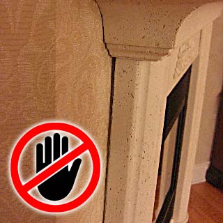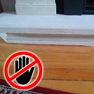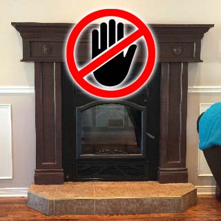 Foyer installé trop haut. Moulure de bois direct autour du foyer.
